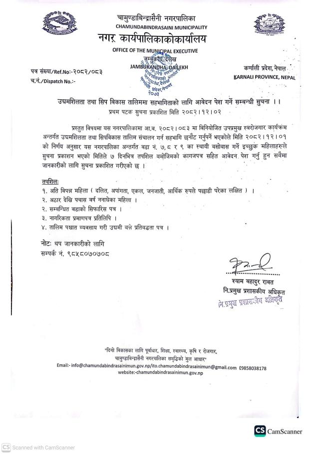 » उधमशिलता तथा सीप बिकास तालिममा सहभागीताको लागि आबेदन पेश गर्ने सम्बन्धी सूचना ।।।