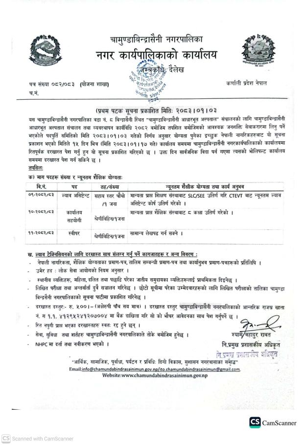 » चामुण्डाबिन्द्रासैनी आधारभुत अस्पतालका लागि करार सेवामा कर्मचारी आबश्यकता सम्वन्धी सूचना ।।।।