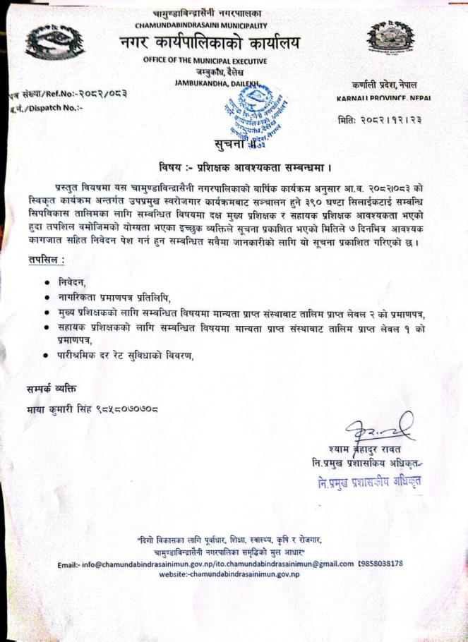 प्रशिक्षक आबश्यकता सम्बन्धमा।।