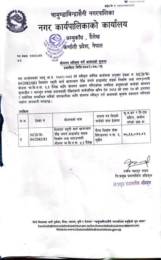 » बोलपत्र स्वीकृत गर्ने आशयको सूचना ।।