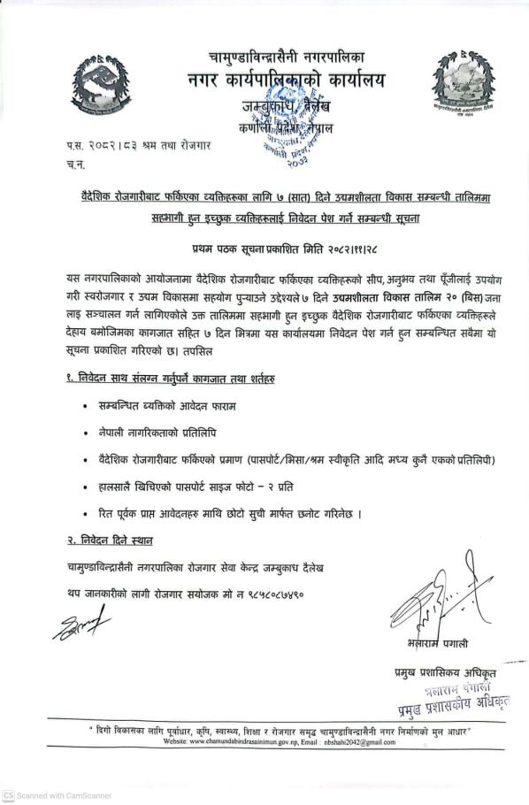 वैदेशिक रोजगारीबाट फर्किएका ब्यक्तिहरुका लागि ७ दिने उधमशिलता बिकास सम्बन्धी तालिममा सहभागी हुन इच्छुक ब्यक्तिहरुलाई निबेदन पेश गर्ने सम्बन्धी सूचना ।।।