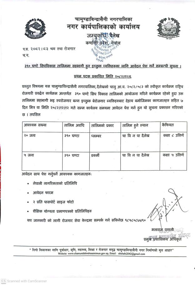 ३९० घण्टे सिपबिकास तालिममा सहभागी हुन इच्छुक ब्यक्तिहरुका लागि आबेदन पेश गर्ने सम्बन्धी सूचना ।।।