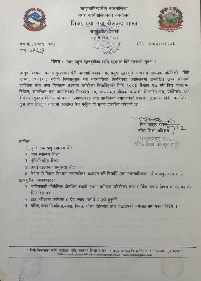 » नगर प्रमुख छात्रवृत्तिका लागि दरखास्त दिने सम्बन्धी सूचना ।